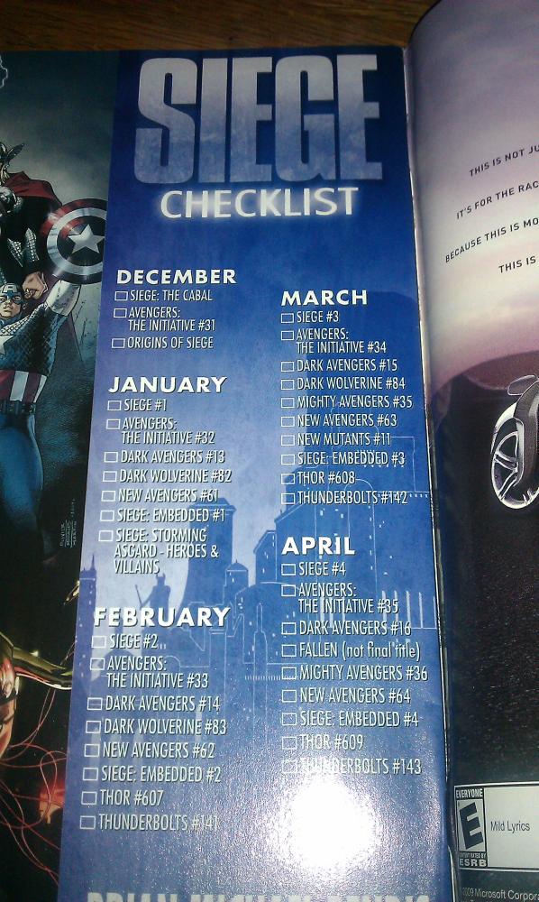That's 3 setup titles, 7 titles the first true month, 8 titles the second month, 10 titles the third month, 9 titles the fourth month, AND that list doesn't show everything including about half a dozen Siege one-shots which only tangentially tie into the series, OR the fcbd story that ties into the ending, there's a total of 43 different issues across 4 and a half months under the Siege banner, 2 of those are free comics, so that's about $168 before tax to try to catch 'em all. And having read a few issues, I guaran-fucking-tee you that they're not all necessary to the series, nor are they all necessary to Dark Avengers, nor is Dark Avengers terribly necessary to them!